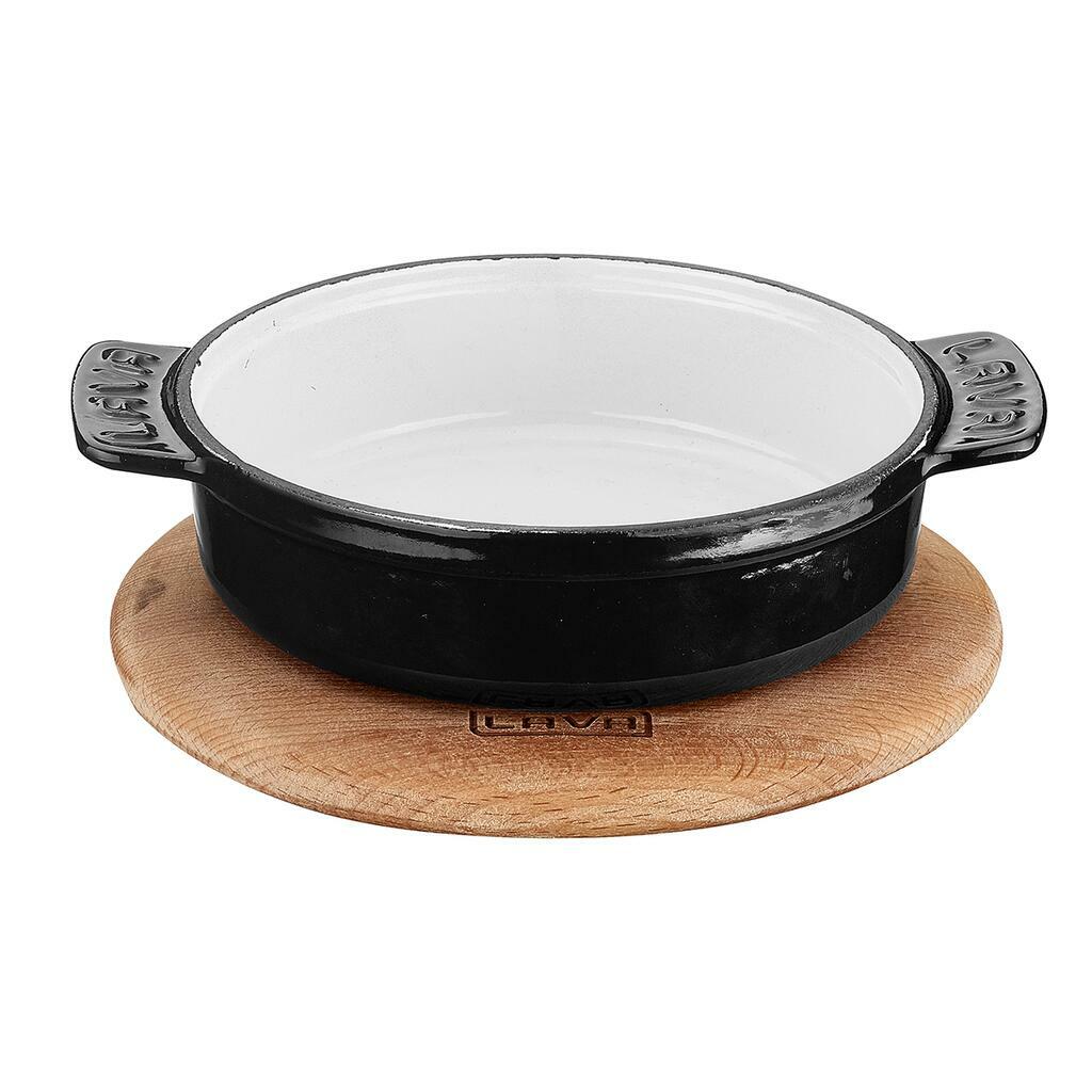 Кастрюля чугунная эмалированная синяя без крышки на деревянной подставке, 17 см, 0,64 л, LAVA