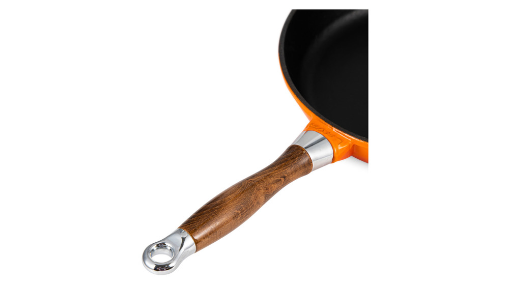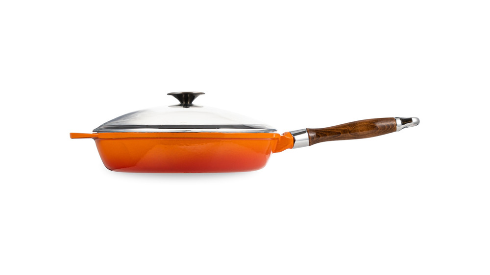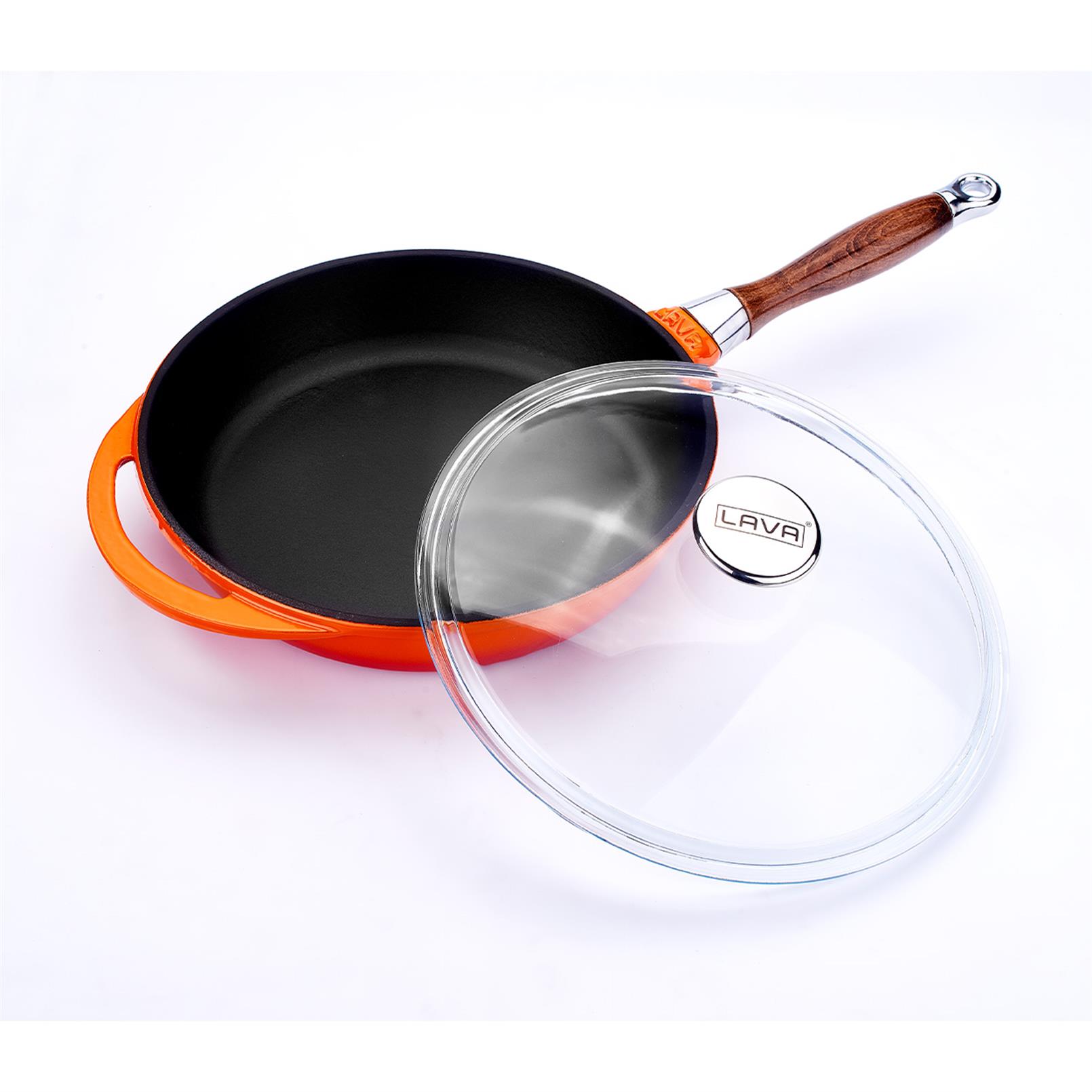 Сковорода чугунная эмалированная оранжевая с крышкой и деревянной ручкой 28 см, 2,8 л, LAVA